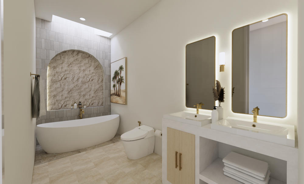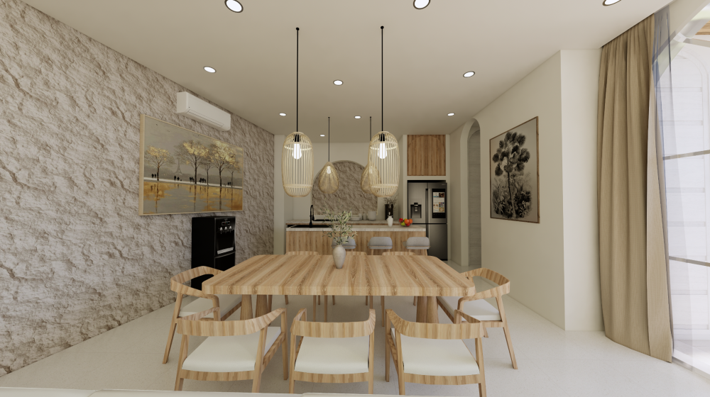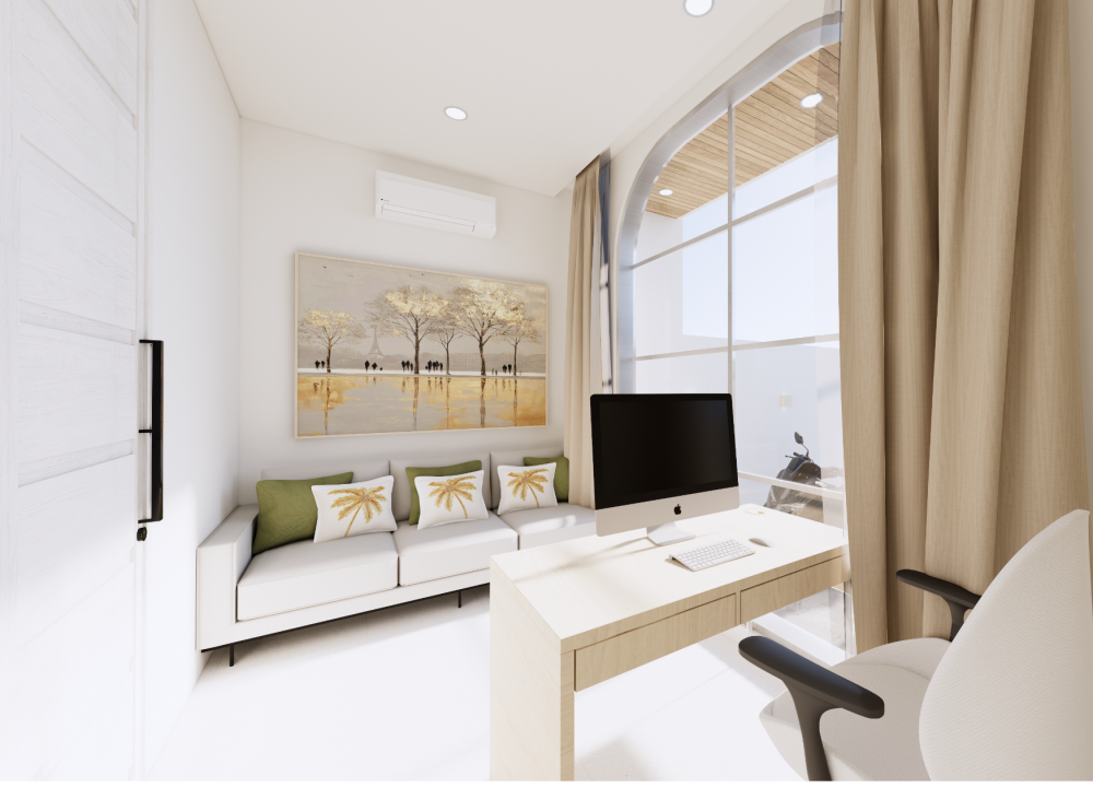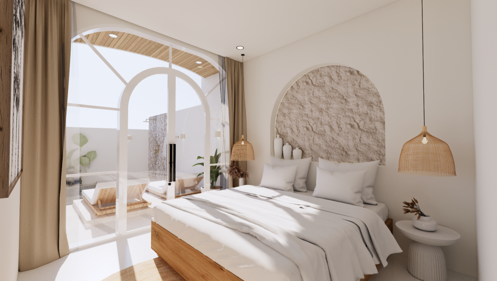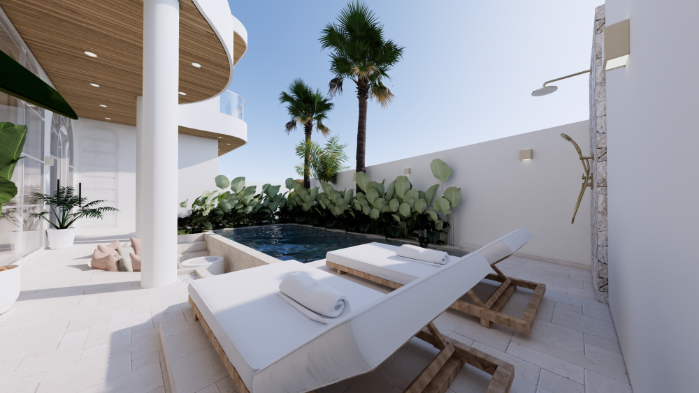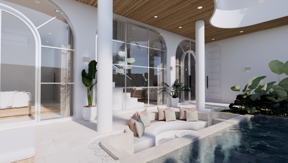 Designed with warm creamy palettes, curved lines and bright open interiors, this villa blends elegance with functionality. The sunken lounge and open-air kitchen create an inviting centre of the home, complemented by a dedicated office and storage room. Outdoors, a 17 m² private pool, tropical greenery and a sunken chill-out area offer space to relax, gather and enjoy everyday Bali living.