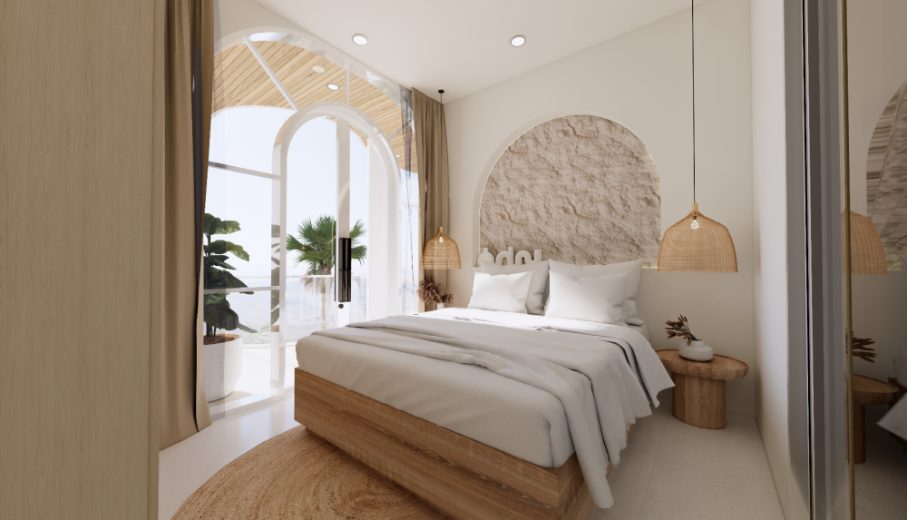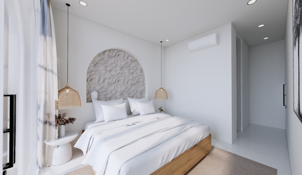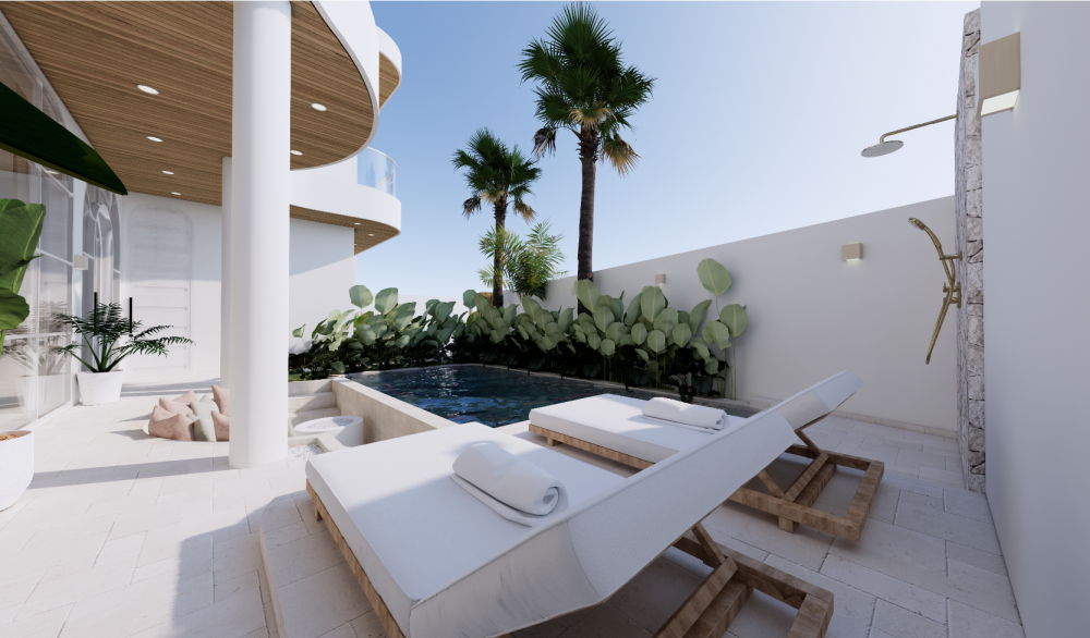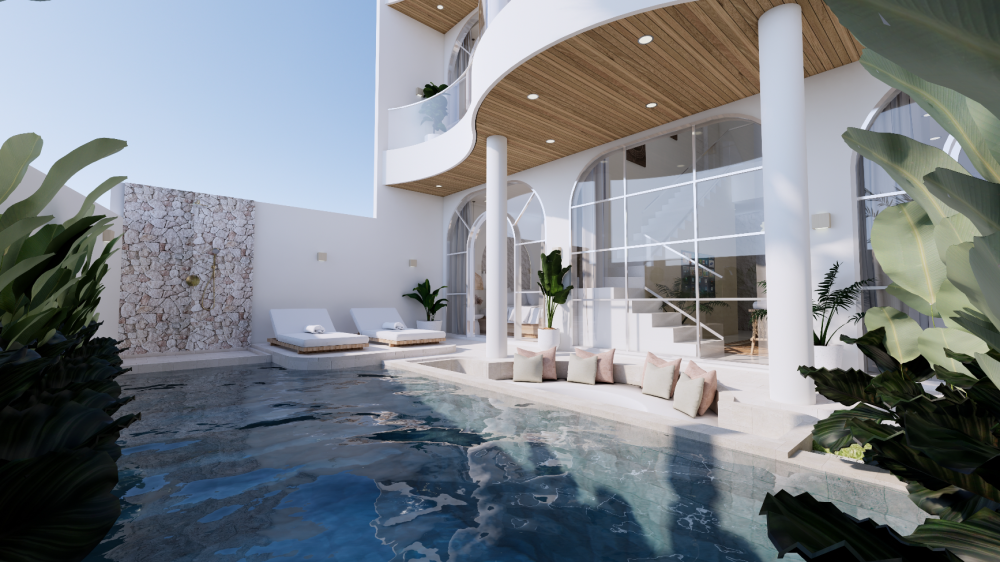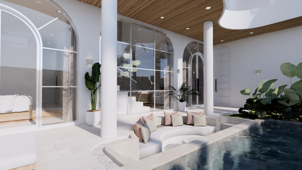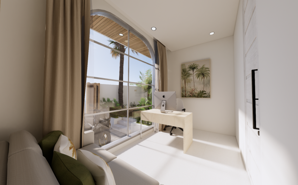 Vila je navrhnutá v teplých krémových tónoch s oblými líniami a svetlými otvorenými interiérmi, ktoré spájajú eleganciu s funkčnosťou. Zapustený obývací priestor a otvorená kuchyňa vytvárajú prirodzené centrum domu, doplnené o samostatnú pracovňu a úložný priestor. Exteriér ponúka súkromný bazén (17 m²), tropickú zeleň a zapustenú chill-out zónu — ideálne miesto na oddych, stretnutia aj každodenný život na Bali.
