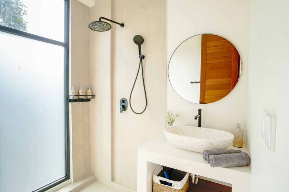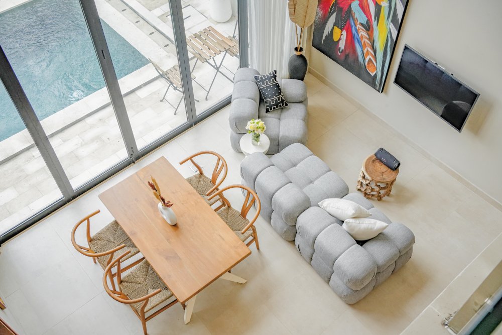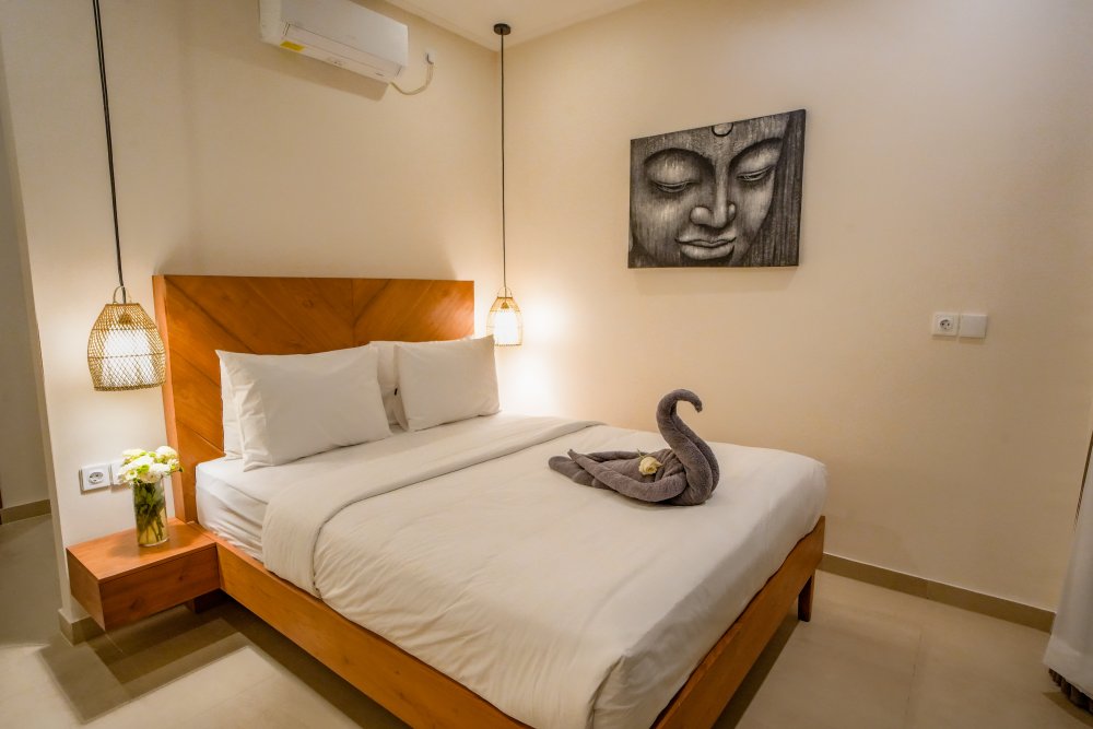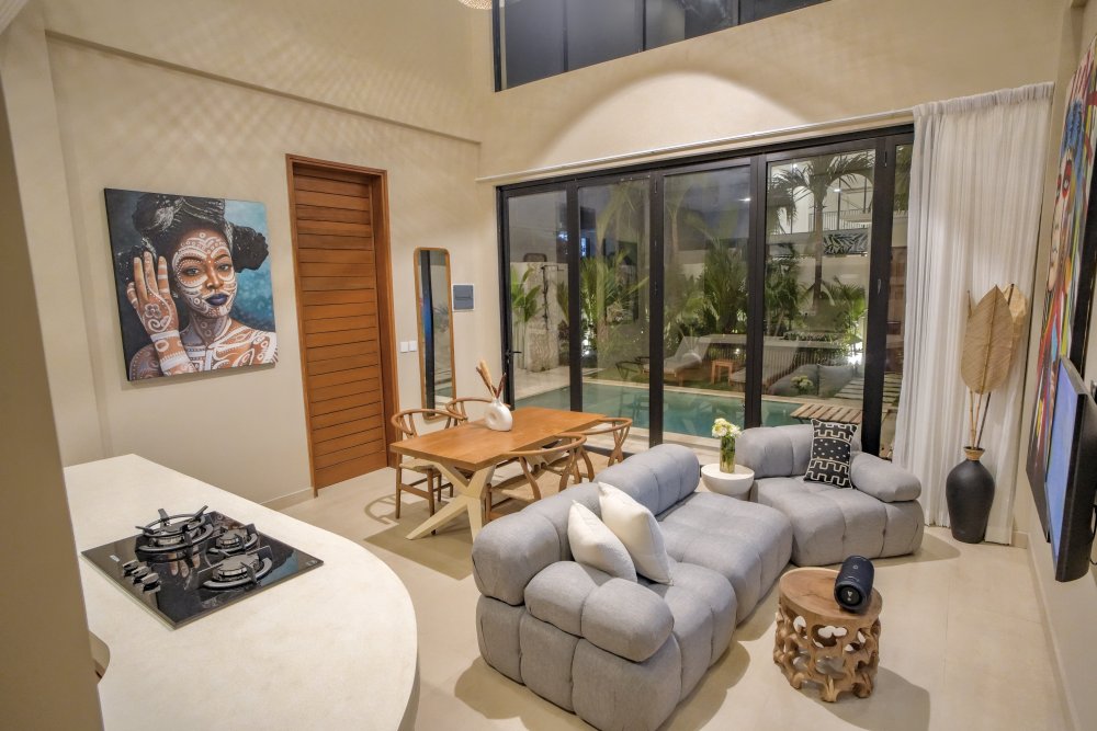 Otvorený obytný priestor plynulo prechádza do súkromného bazéna a záhrady. Každá spálňa má vlastnú kúpeľňu a výhľad na bazén, čo vytvára pokojné rána aj oddychové večery. Interiér je ladený v neutrálnych tónoch a prírodných textúrach, doplnený o farebné umelecké prvky, ktoré dodávajú priestoru charakter a jemný dotyk balianskej energie.